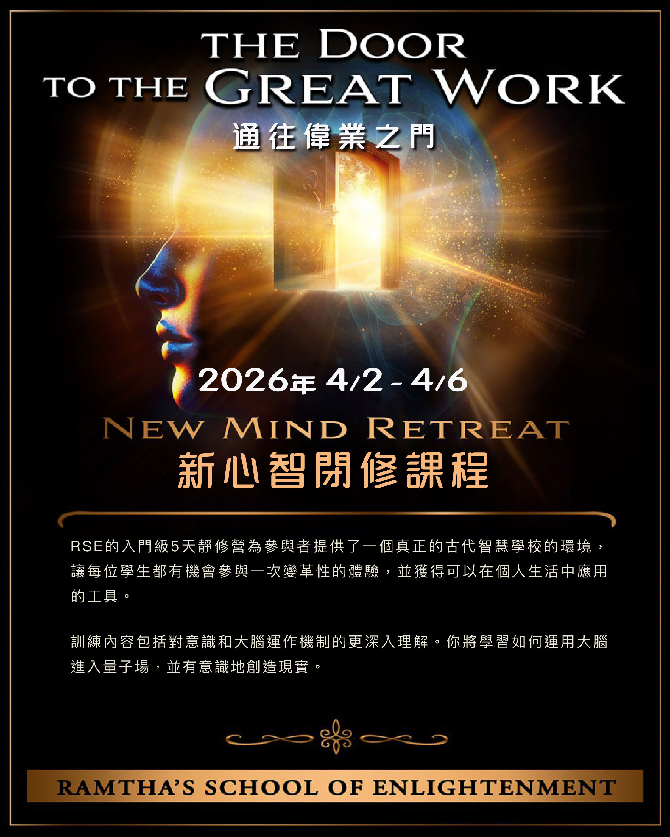 預告新生課程_「新心智閉修課程,通往偉業之門」,台灣現場 2026年4月2日-6日_new mind